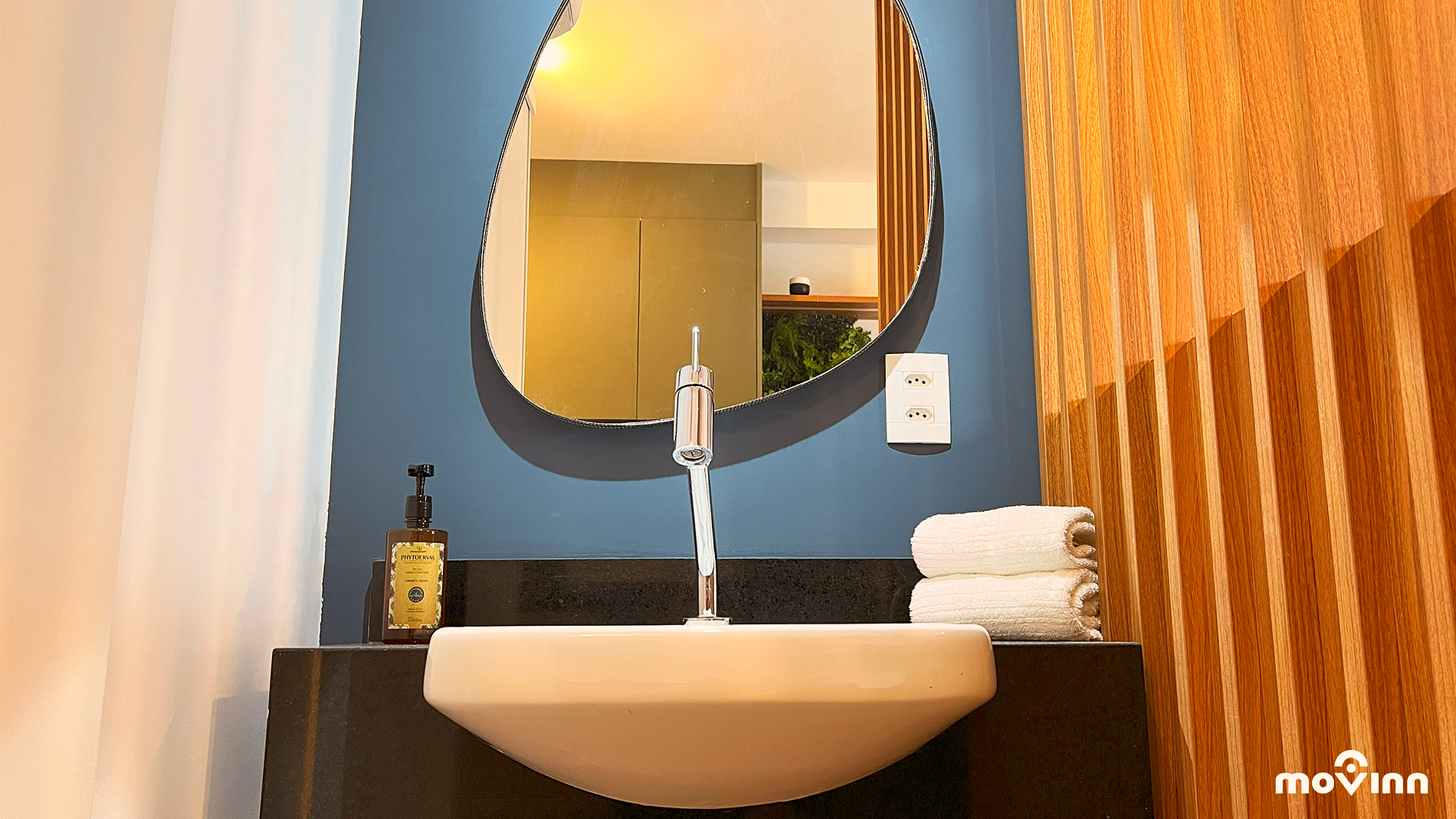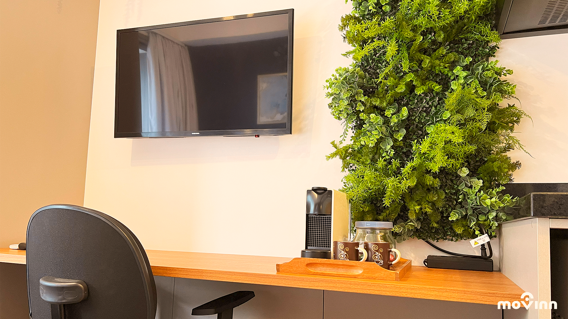O estúdio possui 23 m² muito bem distribuídos, equipado com cama Queen Size (1,98 x 1,58), enxoval completo, amenities Phytoervas, smart TV, internet de 600 mega dedicada, cozinha completa com cafeteira Nespresso e água filtrada (Planeta Água PURE 9), garantindo o pH entre 6 e 8.