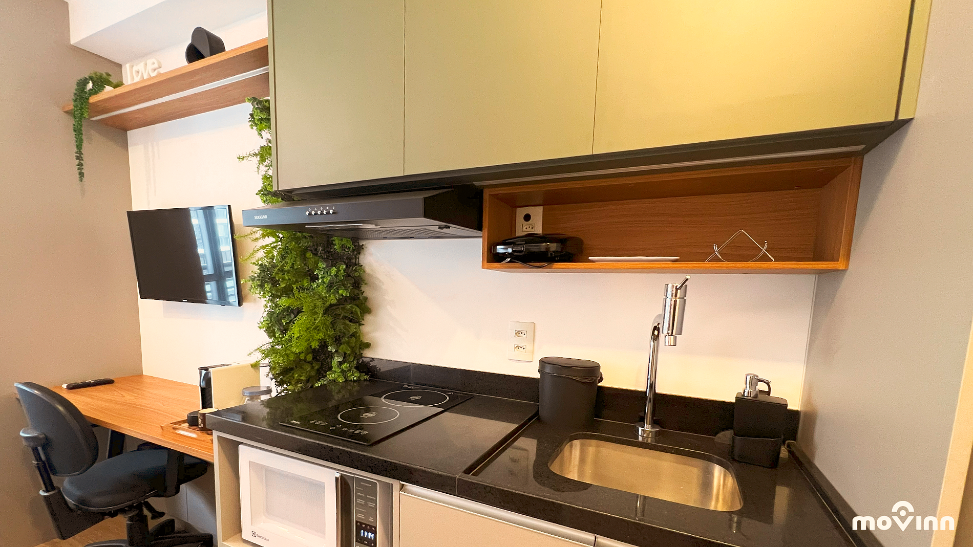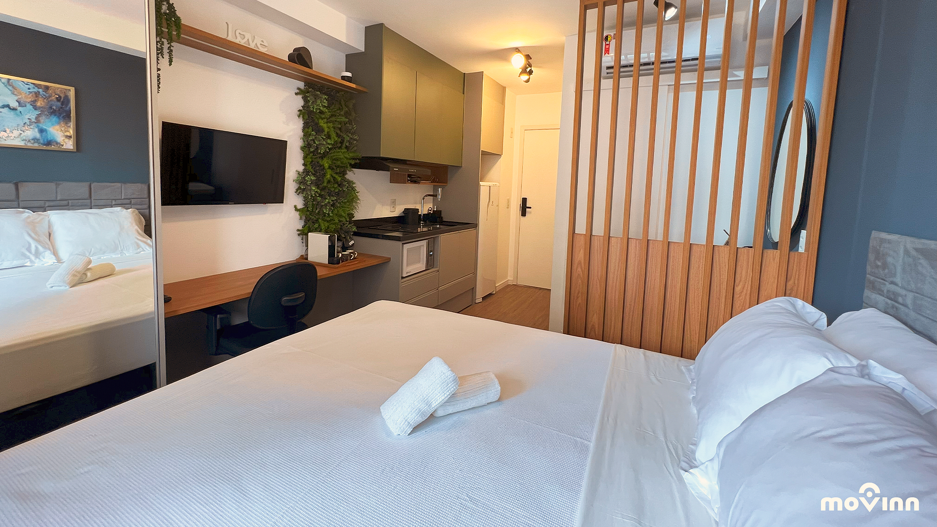 Studio novo de 23m² nos Jardins, com cama Queen Size, enxoval completo, smart tv, internet de 600 mega, ar-condicionado e cozinha completa.