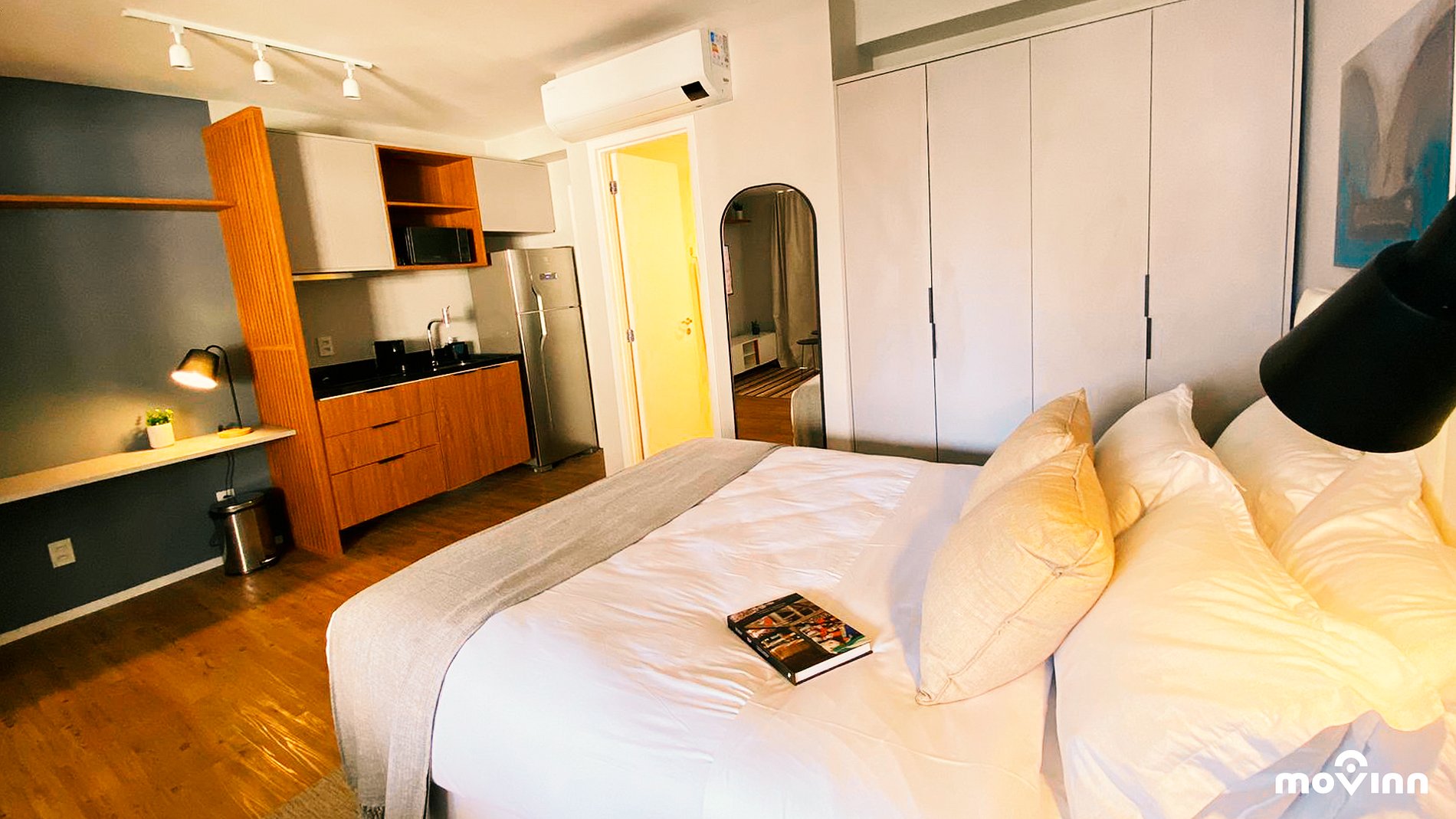 Apartamento novo de 39m² nos Jardins, com cama Queen Size, enxoval completo, smart tv, internet de 600 mega, ar-condicionado e cozinha completa.