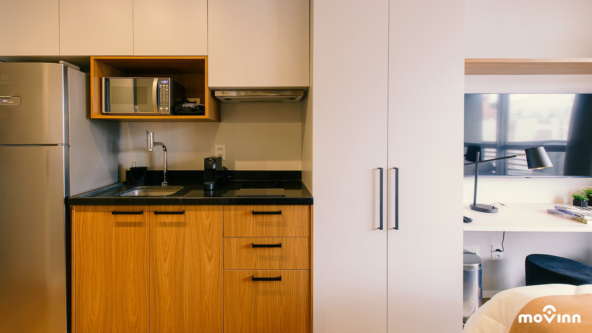 Studio novo de 23m² nos Jardins, com cama Queen Size, enxoval completo, smart tv, internet de 600 mega, ar-condicionado e cozinha completa.