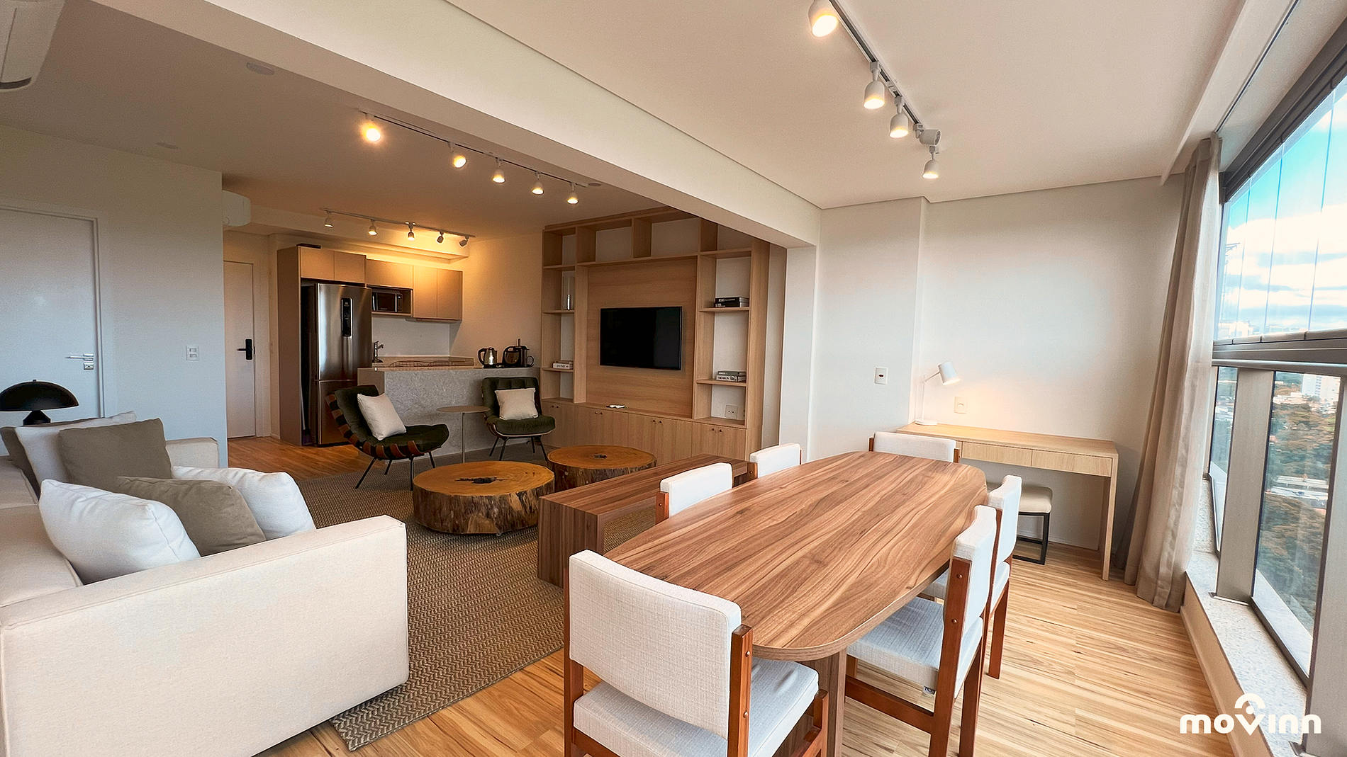 O Apartamento: Com 66 m², o apartamento é completamente equipado para garantir o máximo conforto, conta com cama King Size (1,93 m X 2,03 m) enxoval Trousseau, sala decorada e equipada, Smart TV, amenities Phytoervas, máquina lava e seca, cozinha com cooktop, exaustor, geladeira, forno elétrico, micro-ondas, cafeteira Nespresso, lava louças e água filtrada diretamente da torneira (Planeta Água PURE 9), com pH entre 6 e 8, prezando pela qualidade e bem-estar. Além disso, oferece uma excelente estação de trabalho