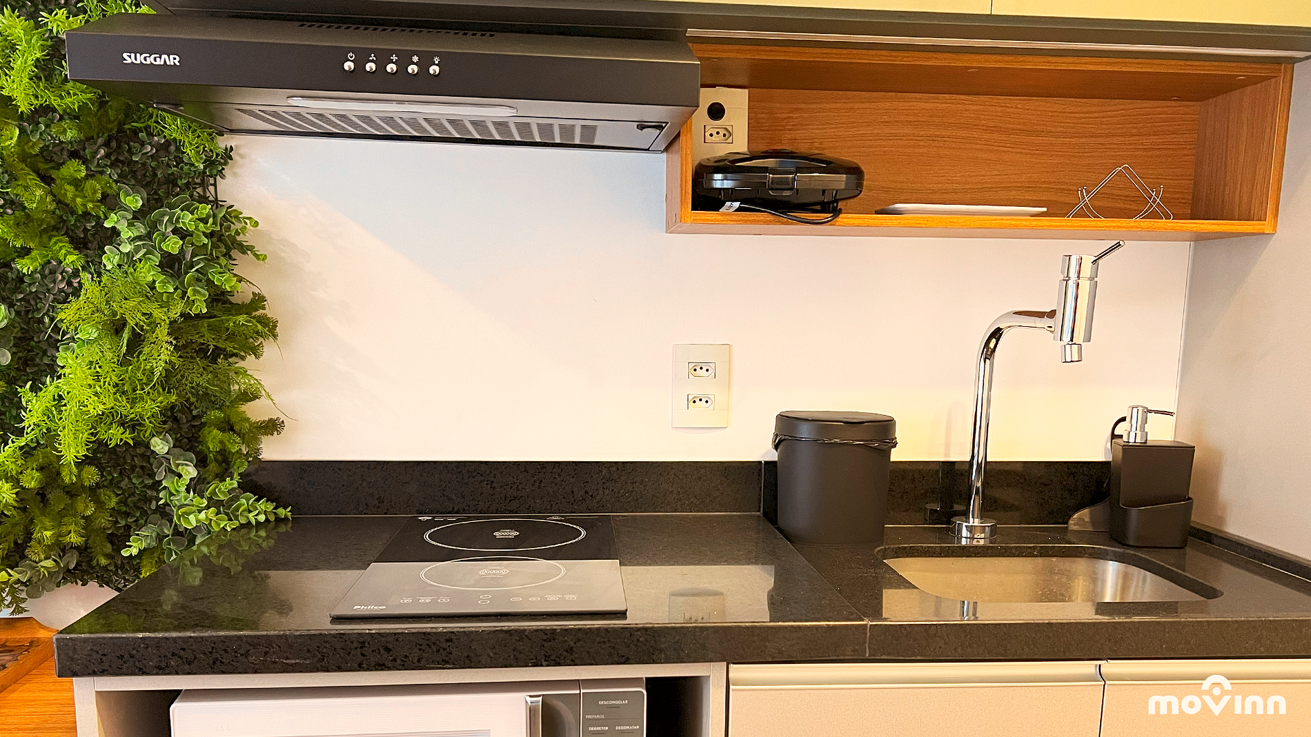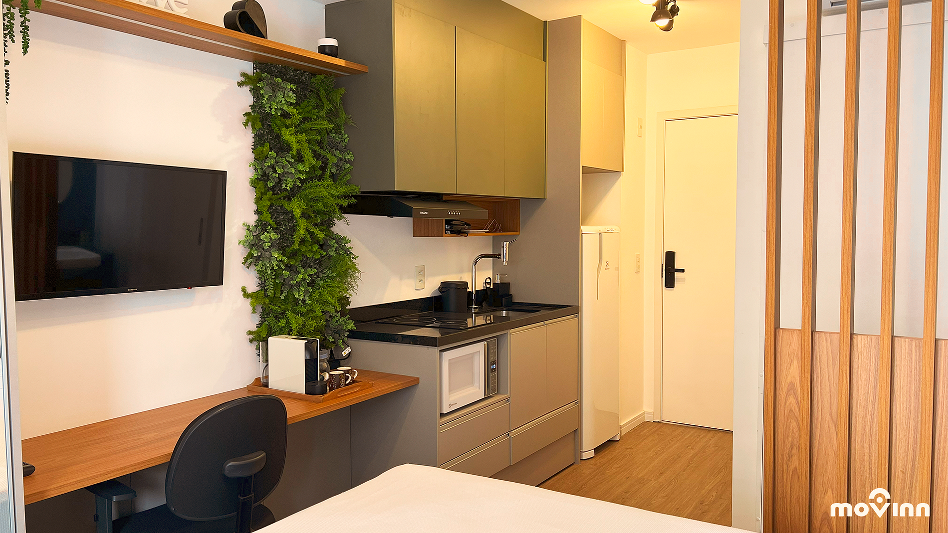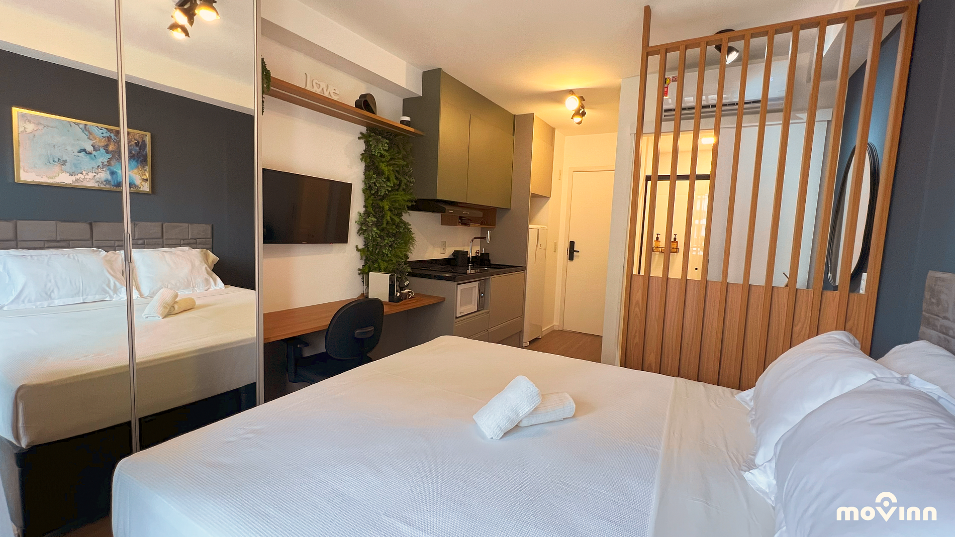 O estúdio possui 23 m² muito bem distribuídos, equipado com cama Queen Size (1,98 x 1,58), enxoval completo, amenities Phytoervas, smart TV, internet de 600 mega dedicada, cozinha completa com cafeteira Nespresso e água filtrada (Planeta Água PURE 9), garantindo o pH entre 6 e 8.