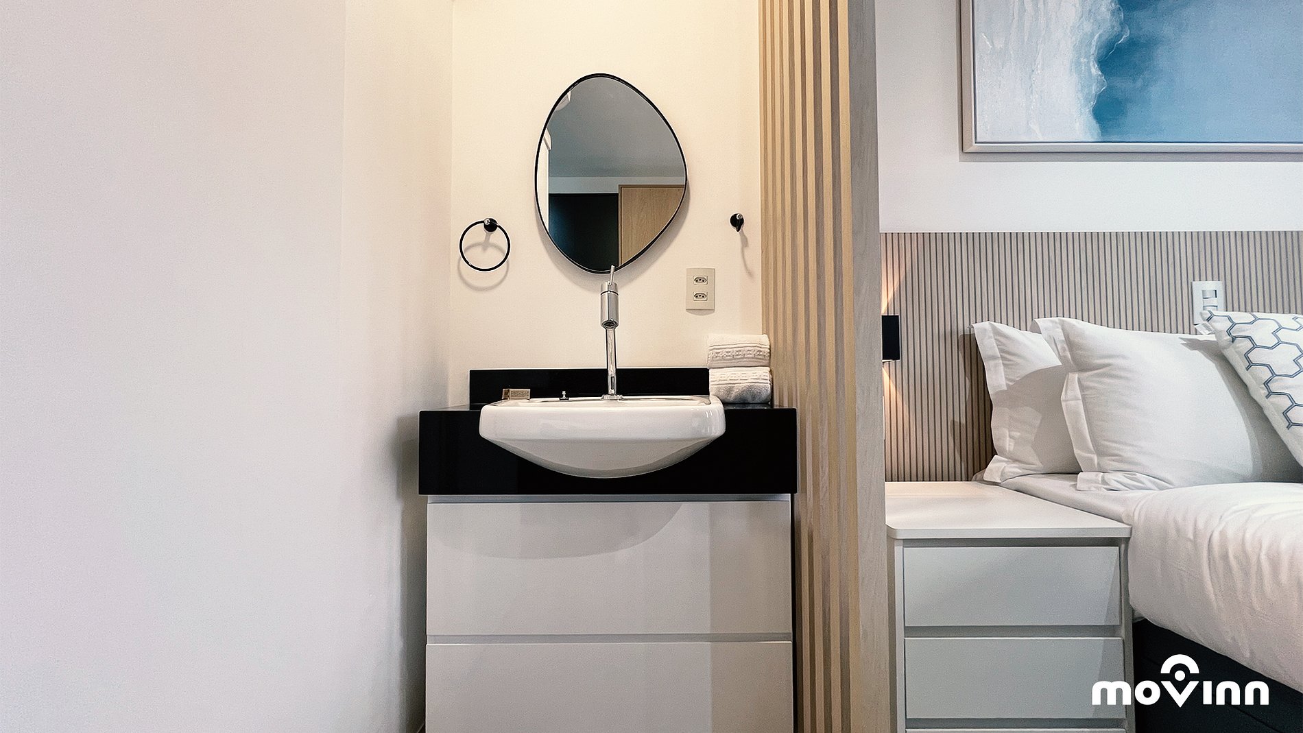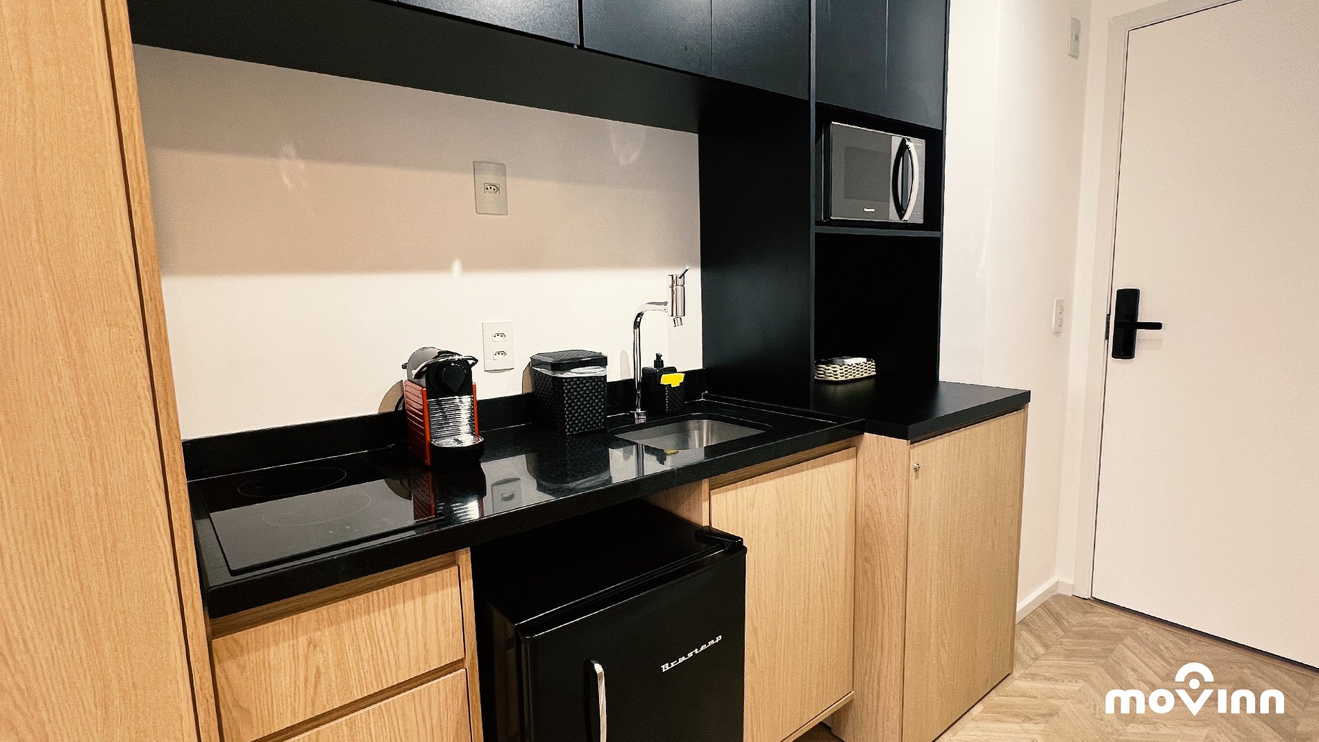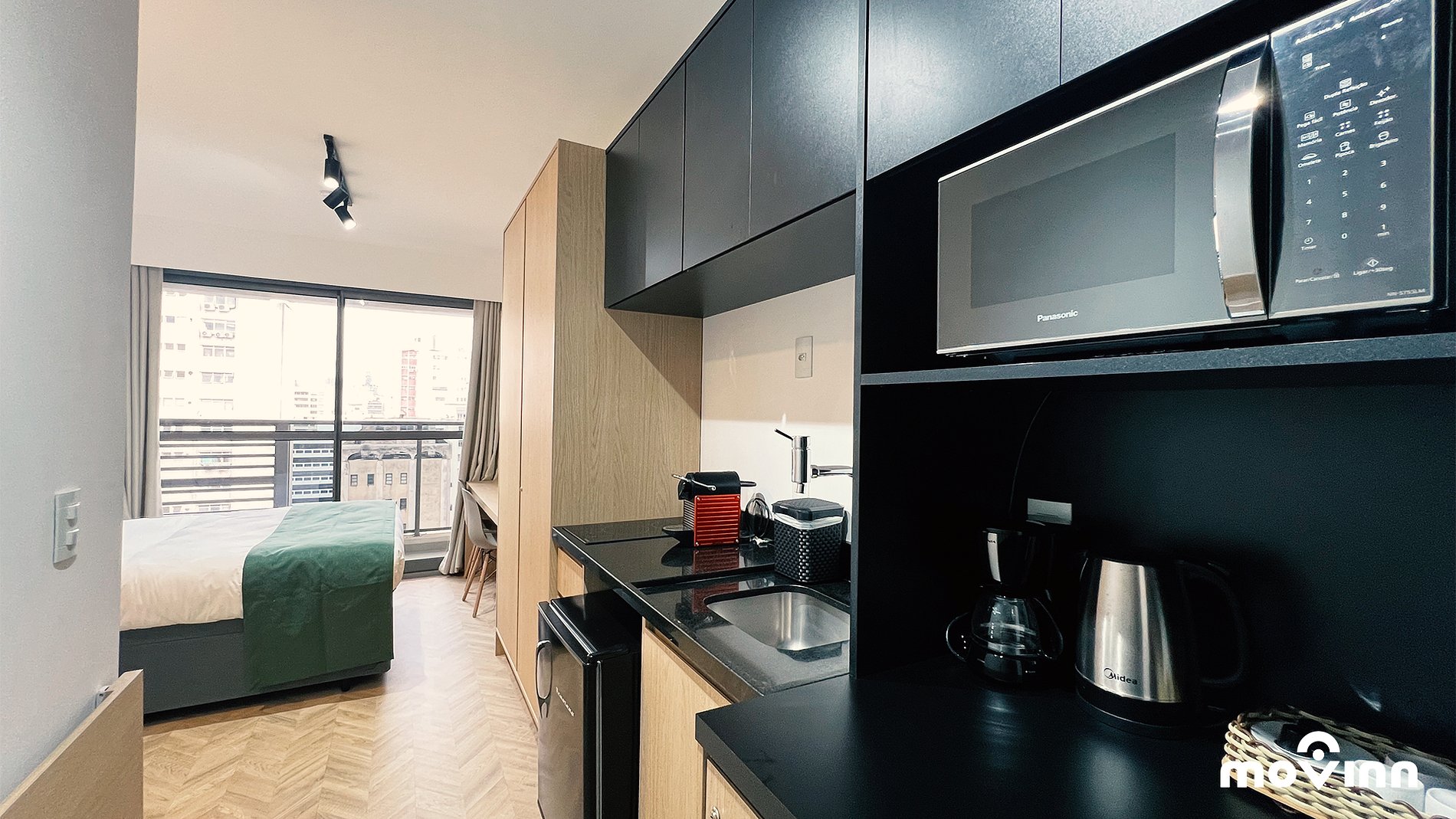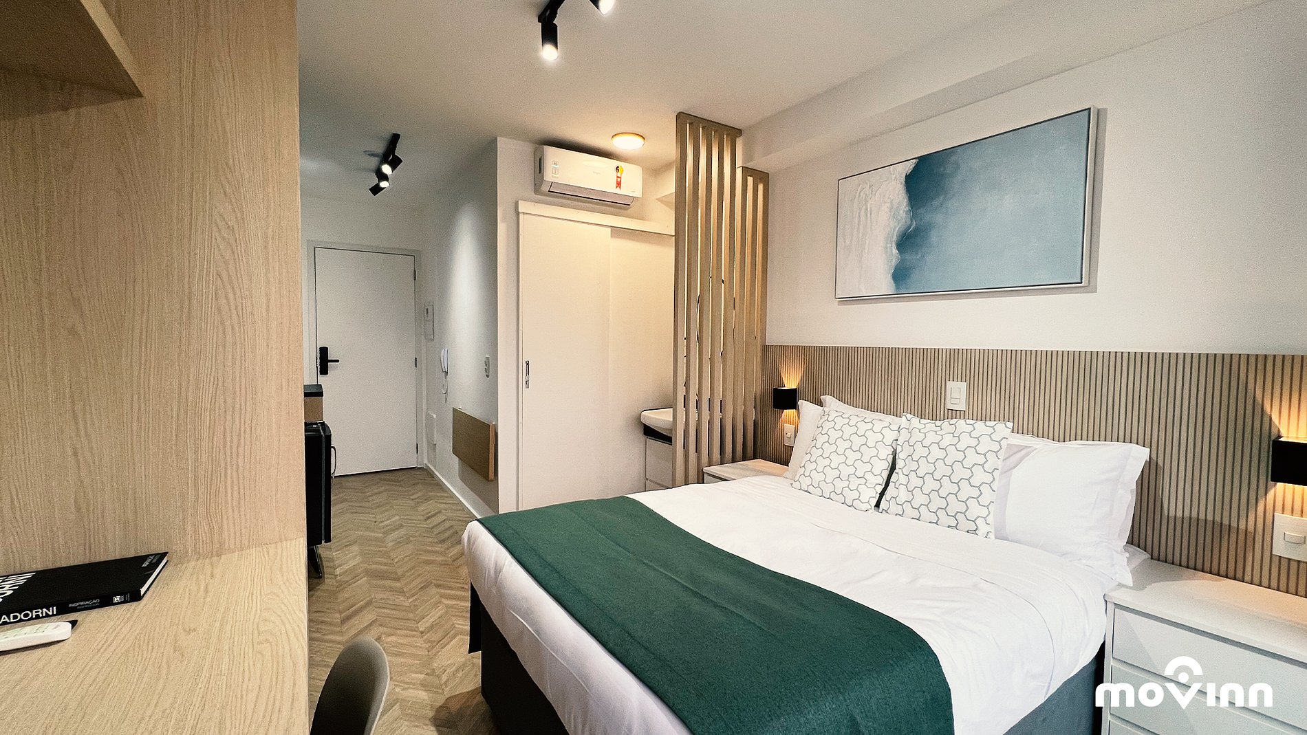 Studio novo de 23m² nos Jardins, com cama Queen Size, enxoval completo, smart tv, internet de 600 mega, ar-condicionado e cozinha completa.