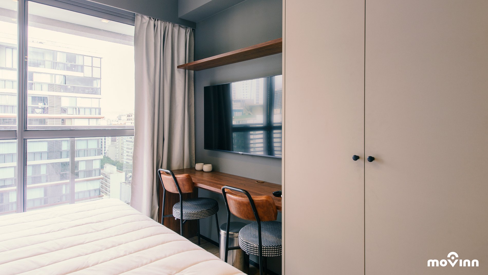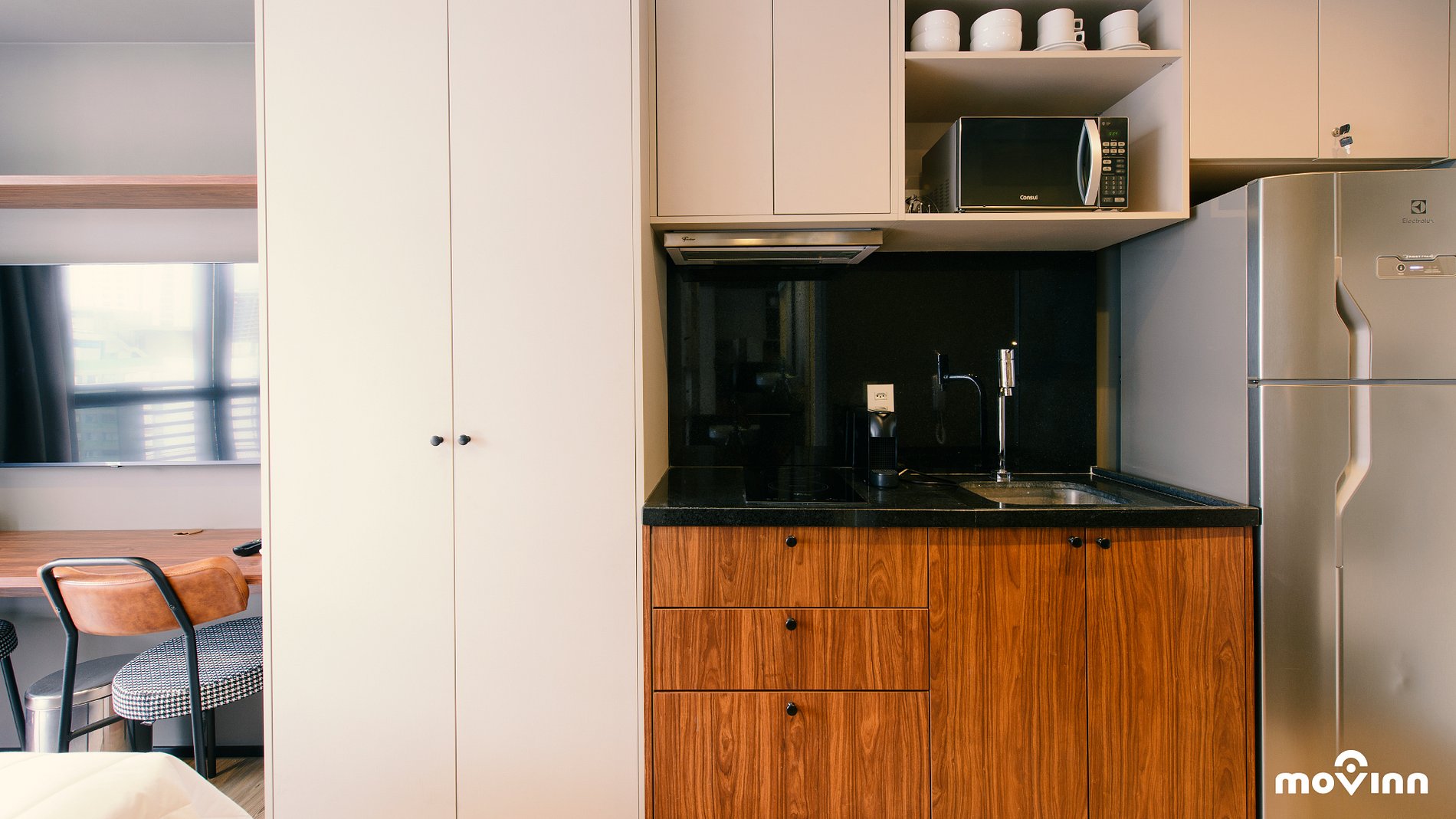 O estúdio possui 23 m² muito bem distribuídos, equipado com cama Queen Size (1,98 x 1,58), enxoval completo, amenities Phytoervas, smart TV, internet de 600 mega dedicada, cozinha completa com cafeteira Nespresso e água filtrada (Planeta Água PURE 9), garantindo o pH entre 6 e 8.