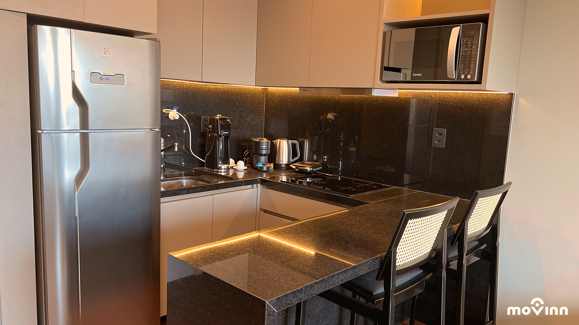 Apartamentos equipados con lavadora, cama Queen Size (158cm x 189cm), ajuar de lencería, amenidades Phytoervas, sala completa, smart TV, cocina con anafe, extractor, refrigerador, horno eléctrico, microondas, cafetera Nespresso, agua filtrada directamente en el grifo (Planeta Água PURE 9) garantizando un pH entre 6 y 8, además de una gran estación de trabajo. Apartamentos nuevos, amueblados, con diseño innovador, listos para entrar a vivir.