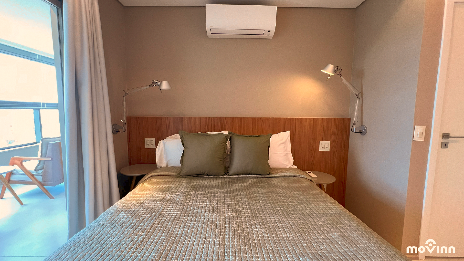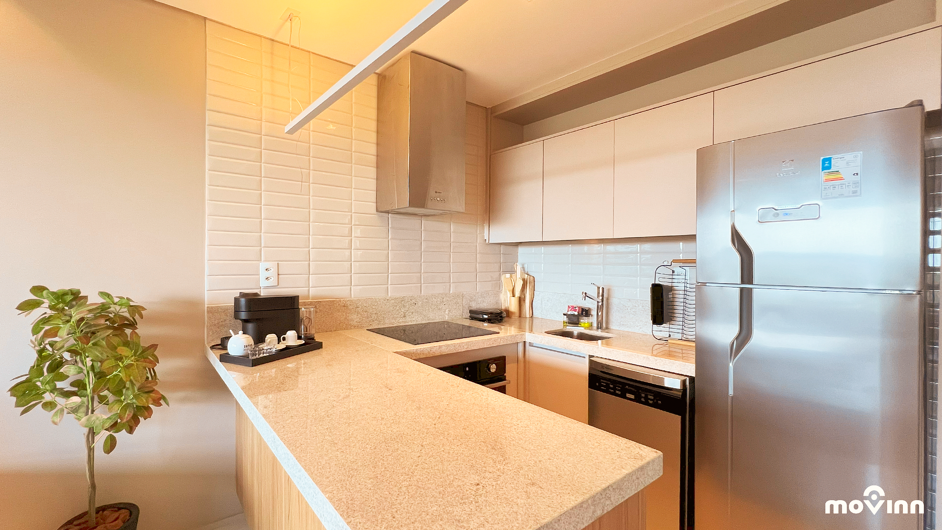 O Apartamento: Com 66 m², o apartamento é completamente equipado para garantir o máximo conforto, conta com cama Queen Size (1,58 m X 1,98 m), sala decorada e equipada, Smart TV, amenities Phytoervas, máquina lava e seca, cozinha com cooktop, exaustor, geladeira, forno elétrico, micro-ondas, cafeteira Nespresso, lava louças e água filtrada diretamente da torneira (Planeta Água PURE 9), com pH entre 6 e 8, prezando pela qualidade e bem-estar. Além disso, oferece uma excelente estação de trabalho