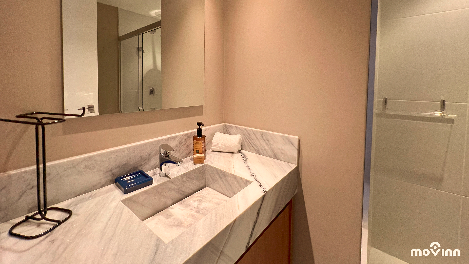 O Apartamento: Com 66 m², o apartamento é completamente equipado para garantir o máximo conforto, conta com cama Queen Size (1,58 m X 1,98 m), sala decorada e equipada, Smart TV, amenities Phytoervas, máquina lava e seca, cozinha com cooktop, exaustor, geladeira, forno elétrico, micro-ondas, cafeteira Nespresso, lava louças e água filtrada diretamente da torneira (Planeta Água PURE 9), com pH entre 6 e 8, prezando pela qualidade e bem-estar. Além disso, oferece uma excelente estação de trabalho