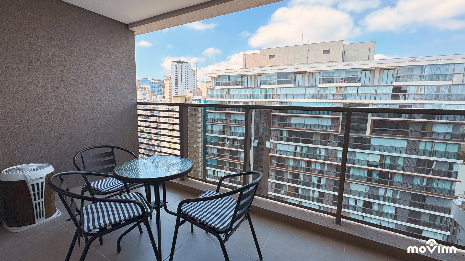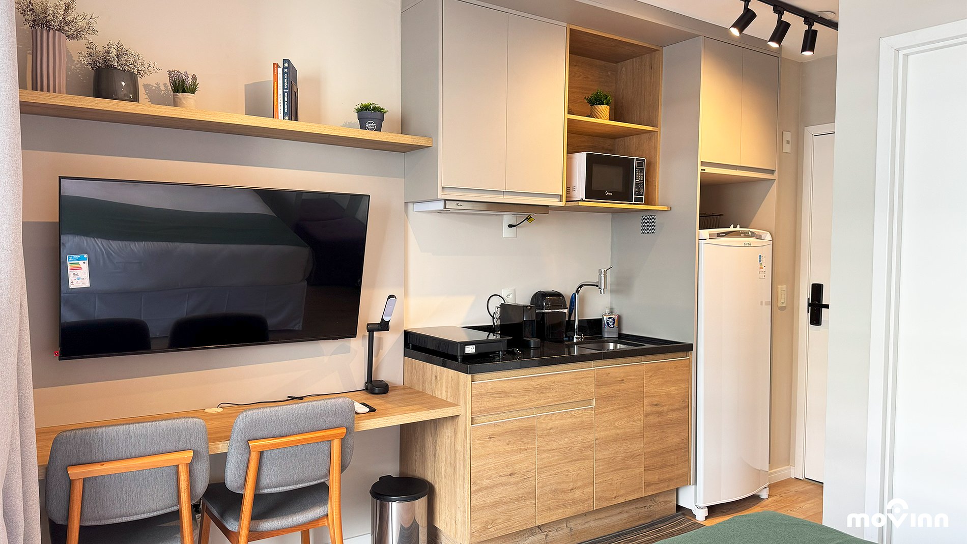 Studio novo de 27m² nos Jardins, com cama Queen Size, enxoval completo, smart tv, internet de 600 mega, ar-condicionado e cozinha completa.