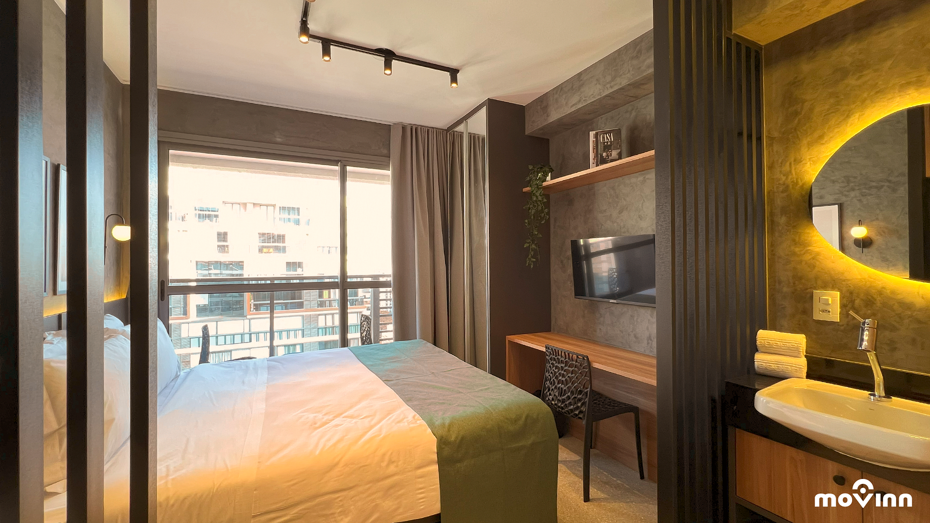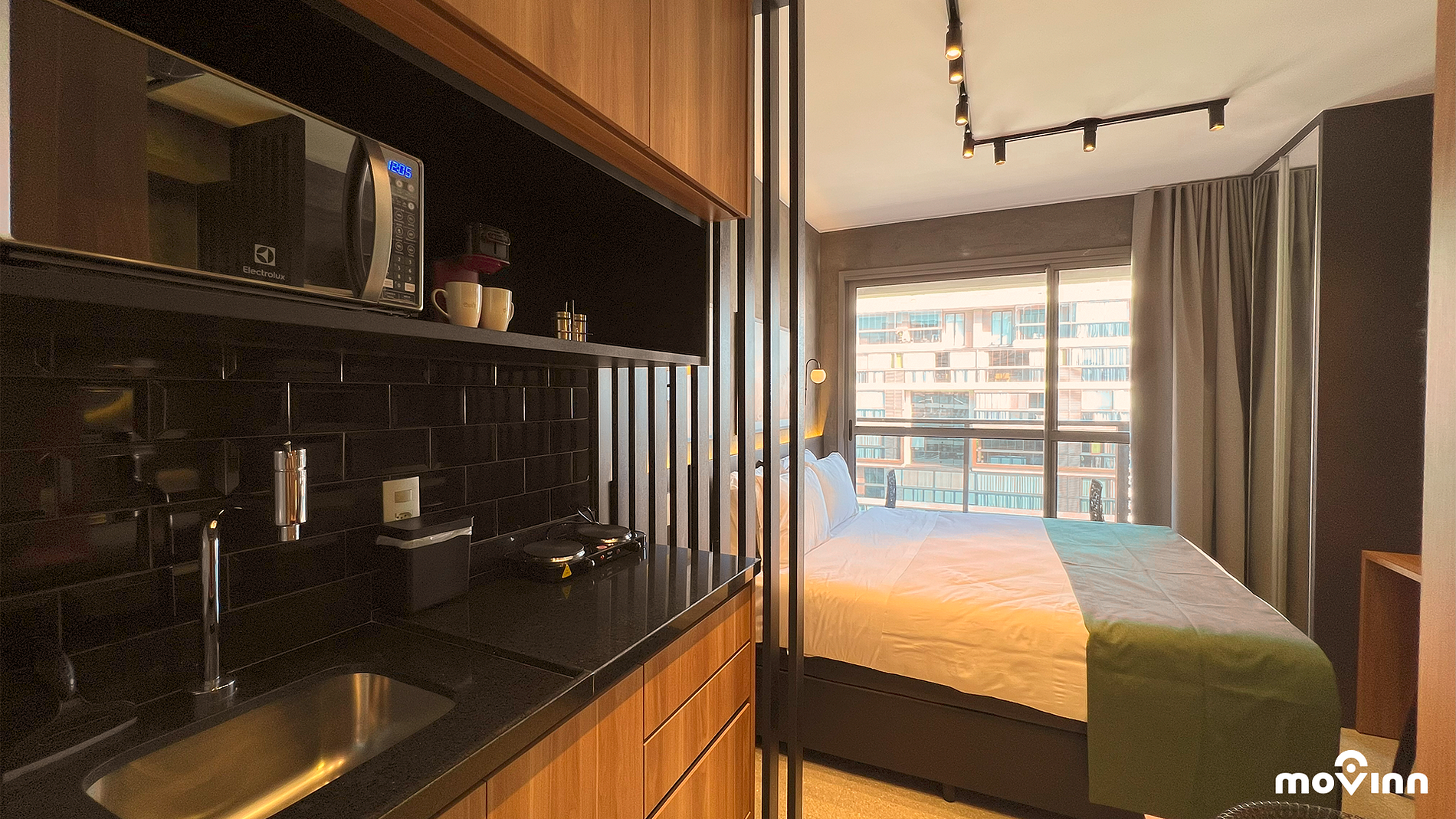 Studio novo de 23m² nos Jardins, com cama Queen Size, enxoval completo, smart tv, internet de 600 mega, ar-condicionado e cozinha completa.