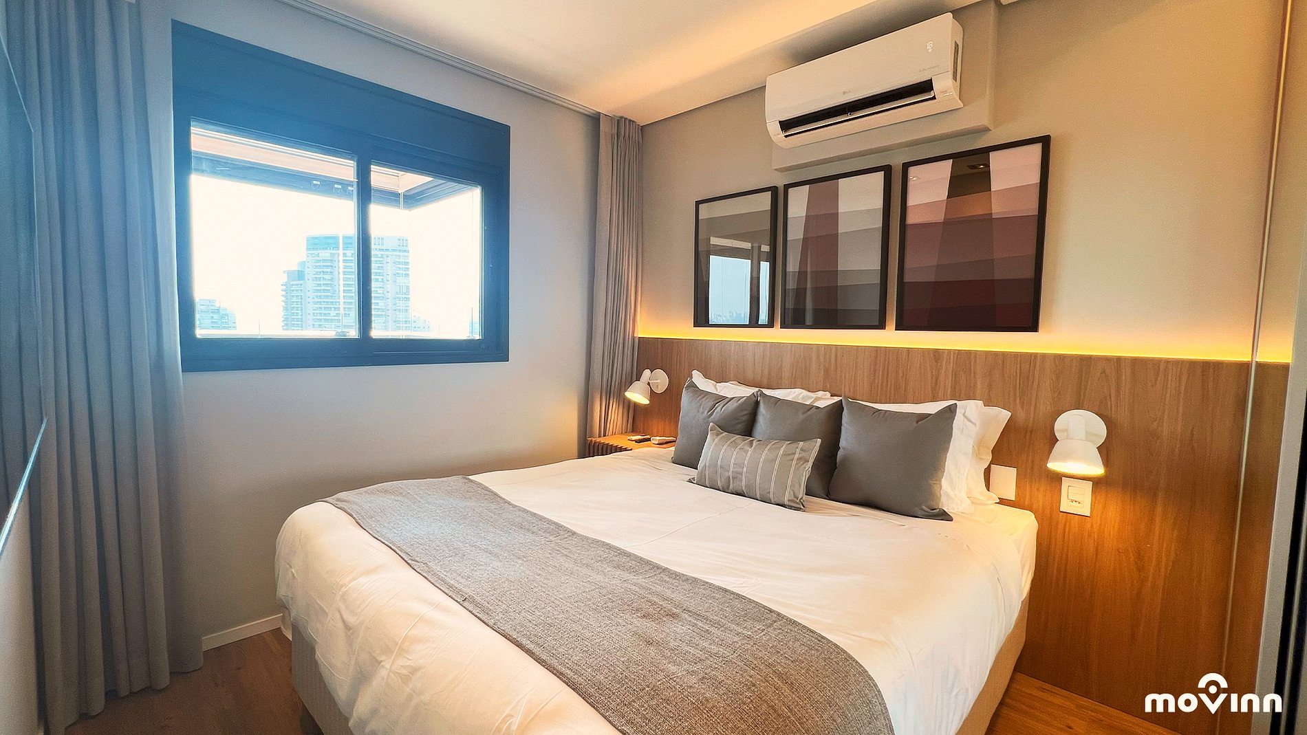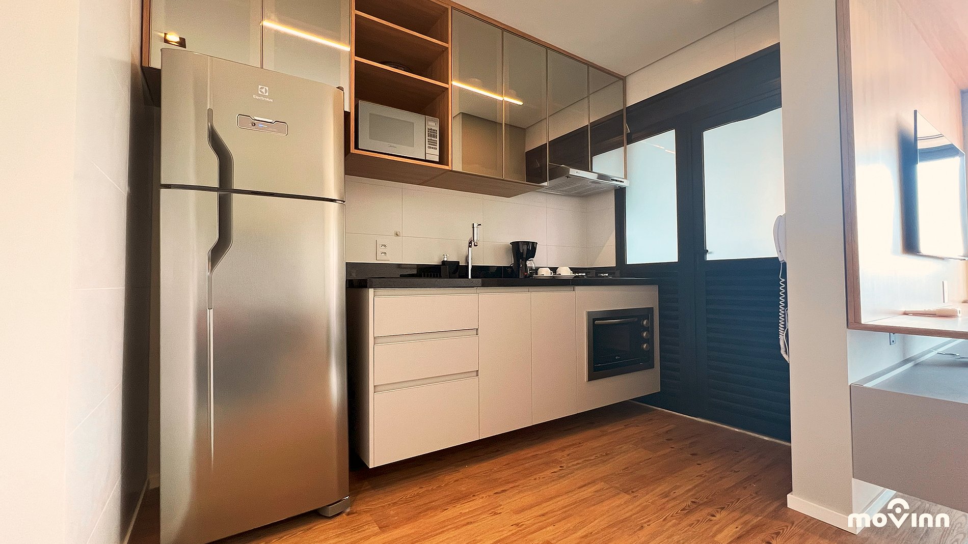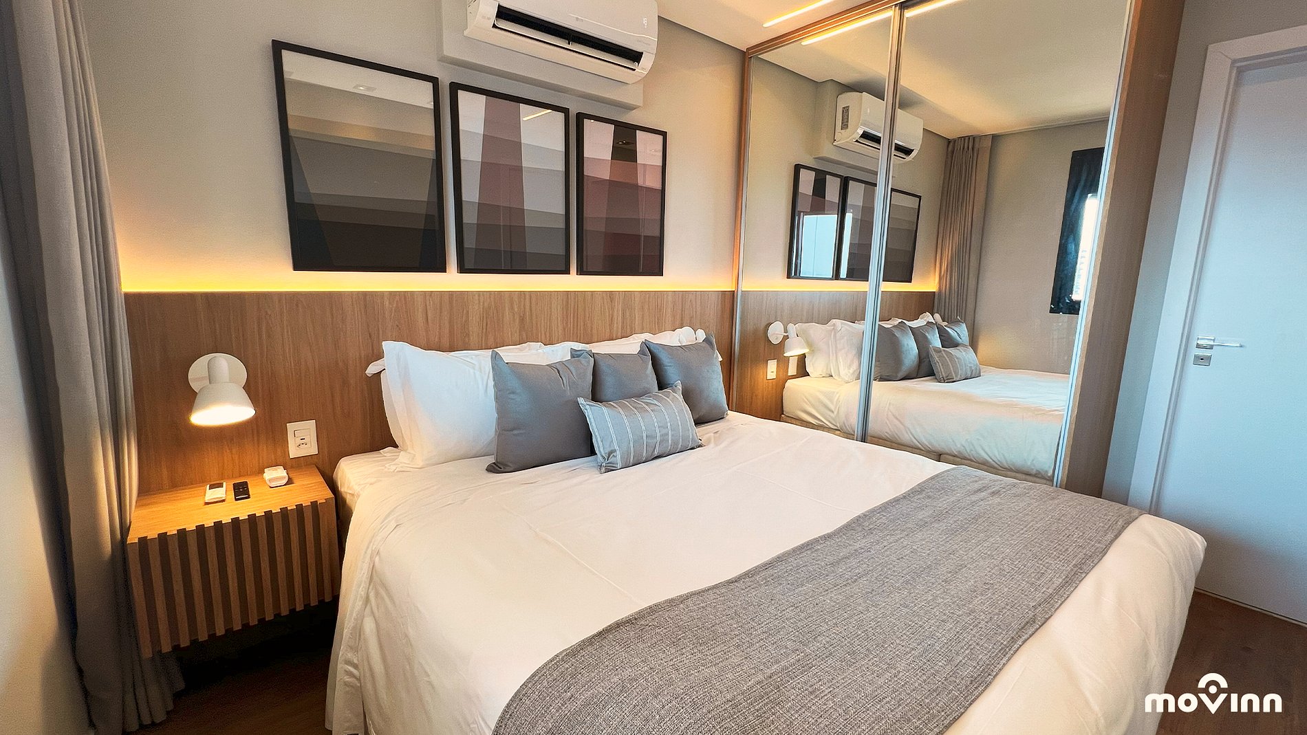 Com serviço de arrumação diária, o apartamento tem 48 m² e está completamente equipado para seu conforto, conta com uma cama Queen Size (1,58 x 1,98), sofá cama, enxoval completo da Niazi, Smart TV, amenidades Phytoervas, máquina de lavar, além de uma sala decorada com móveis modernos e novos, a água filtrada (Planeta Água PURE 9) está disponível, com pH entre 6 e 8, garantindo qualidade e bem-estar.