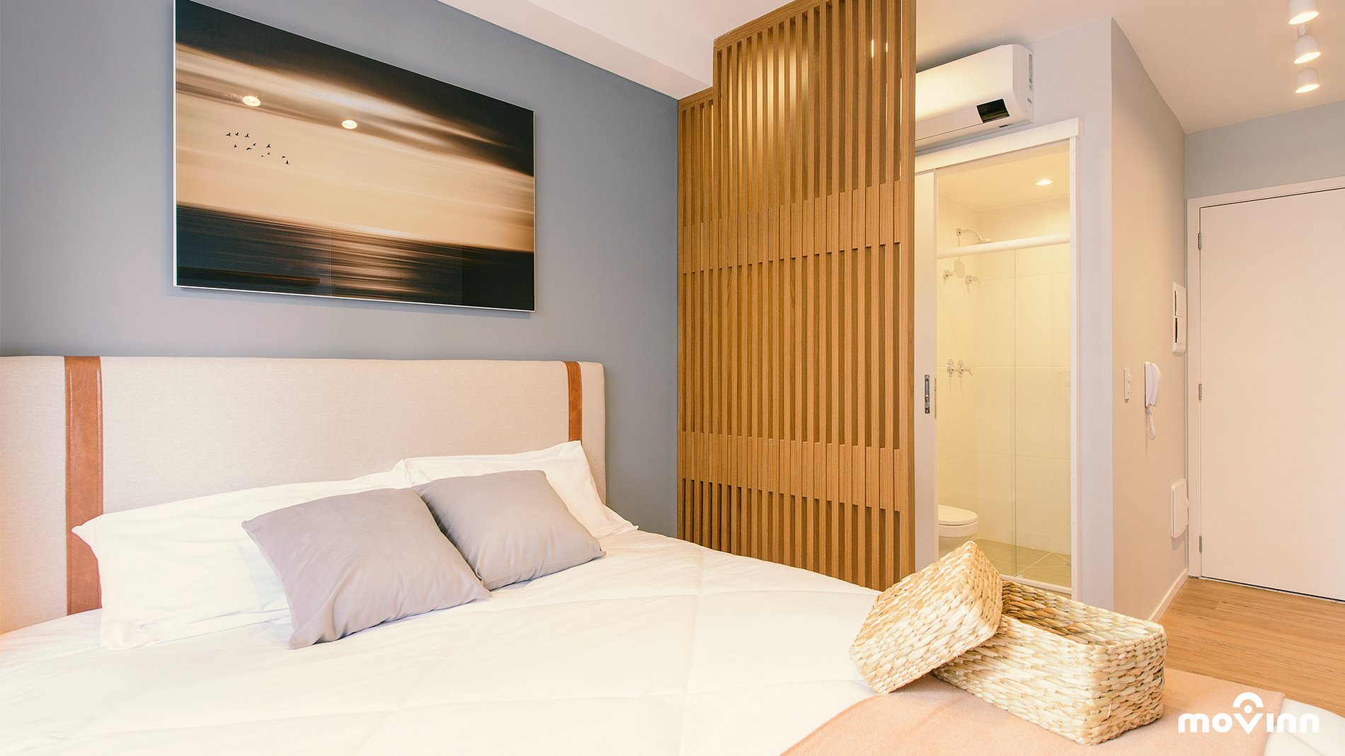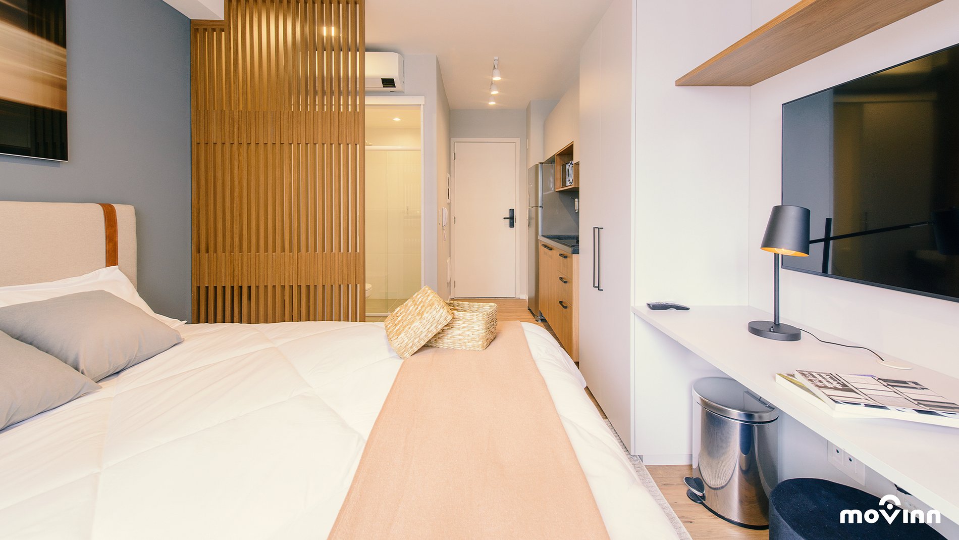 O estúdio possui 23 m² muito bem distribuídos, equipado com cama Queen Size (1,98 x 1,58), enxoval completo, amenities Phytoervas, smart TV, internet de 600 mega dedicada, cozinha completa com cafeteira Nespresso e água filtrada (Planeta Água PURE 9), garantindo o pH entre 6 e 8.