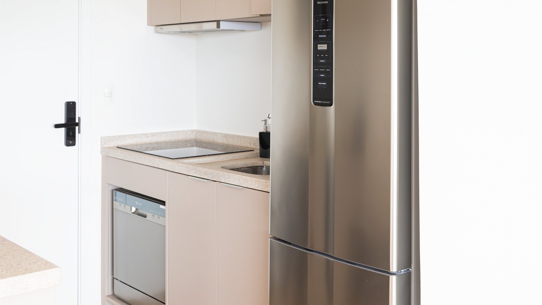 O Apartamento: Com 75 m², o apartamento é completamente equipado para garantir o máximo conforto, conta com cama King Size (1,93 m X 2,03 m) enxoval Trousseau, sala decorada e equipada, Smart TV, internet de 600 mega, amenities Phytoervas, máquina lava e seca, cozinha com cooktop, exaustor, geladeira, forno elétrico, micro-ondas, cafeteira Nespresso, lava louças e água filtrada diretamente da torneira (Planeta Água PURE 9), com pH entre 6 e 8, prezando pela qualidade e bem-estar. Além disso, oferece uma excelente estação de trabalho