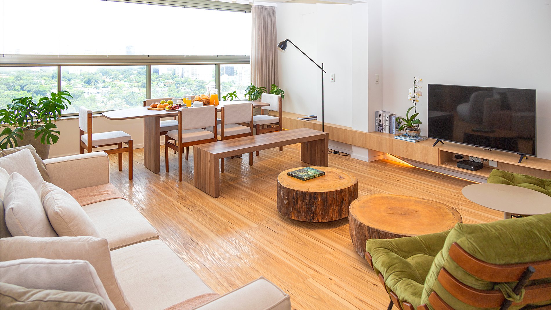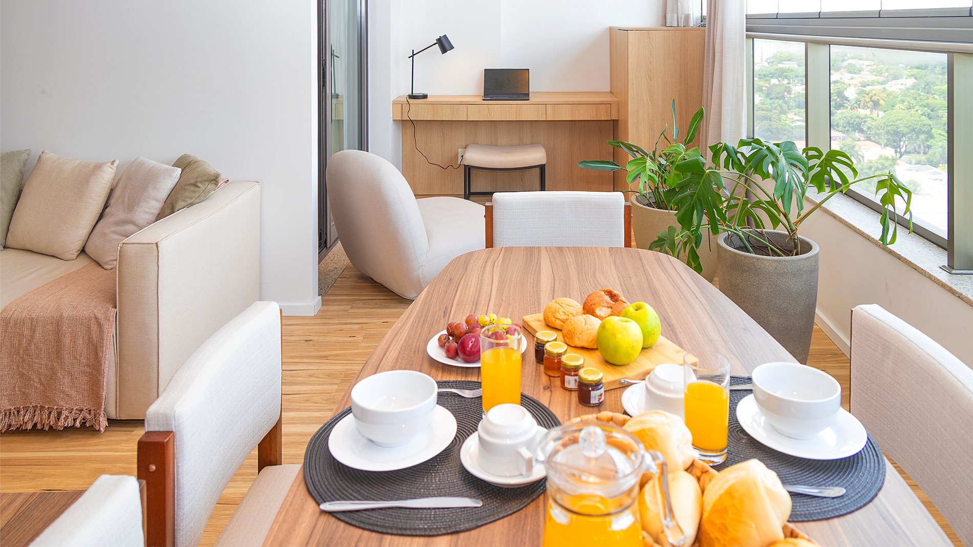 O Apartamento: Com 66 m², o apartamento é completamente equipado para garantir o máximo conforto, conta com cama King Size (1,93 m X 2,03 m) enxoval Trousseau, sala decorada e equipada, Smart TV, amenities Phytoervas, máquina lava e seca, cozinha com cooktop, exaustor, geladeira, forno elétrico, micro-ondas, cafeteira Nespresso, lava louças e água filtrada diretamente da torneira (Planeta Água PURE 9), com pH entre 6 e 8, prezando pela qualidade e bem-estar. Além disso, oferece uma excelente estação de trabalho