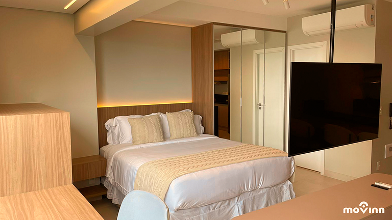 O Estúdio: O Estúdio: Com 39 m², o estúdio é completamente equipado para garantir o máximo conforto, conta com cama Queen Size (1,58 m X 1,98 m), sala decorada e equipada, Smart TV, amenities Phytoervas, cozinha com cooktop, exaustor, geladeira, micro-ondas, cafeteira Nespresso e água filtrada diretamente da torneira (Planeta Água PURE 9), com pH entre 6 e 8, prezando pela qualidade e bem-estar. Além disso, oferece uma excelente estação de trabalho.