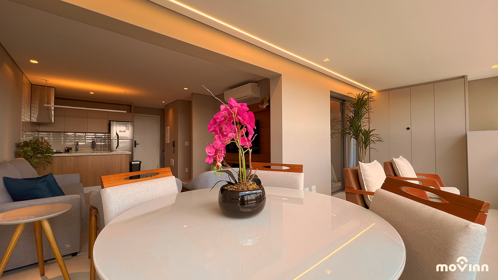 O Apartamento: Com 66 m², o apartamento é completamente equipado para garantir o máximo conforto, conta com cama Queen Size (1,58 m X 1,98 m), sala decorada e equipada, Smart TV, amenities Phytoervas, máquina lava e seca, cozinha com cooktop, exaustor, geladeira, forno elétrico, micro-ondas, cafeteira Nespresso, lava louças e água filtrada diretamente da torneira (Planeta Água PURE 9), com pH entre 6 e 8, prezando pela qualidade e bem-estar. Além disso, oferece uma excelente estação de trabalho
