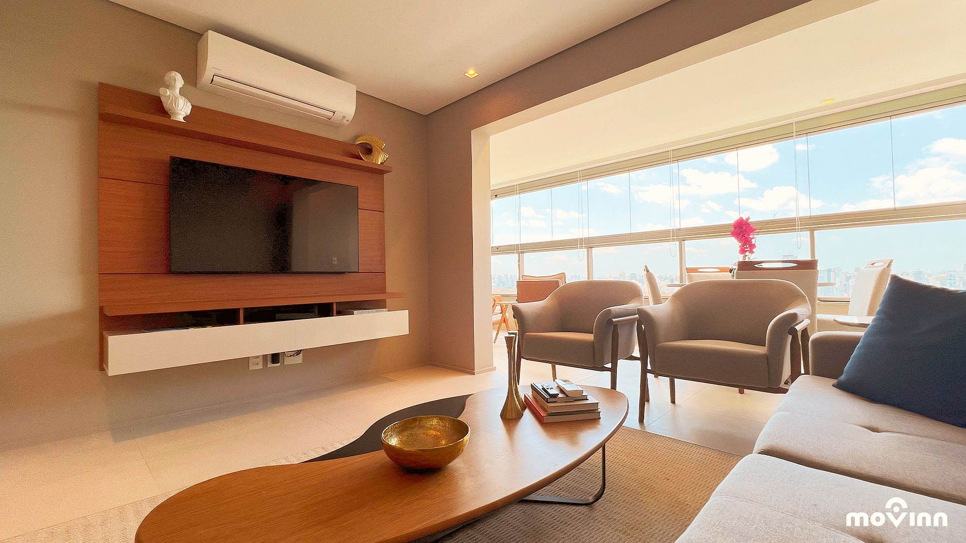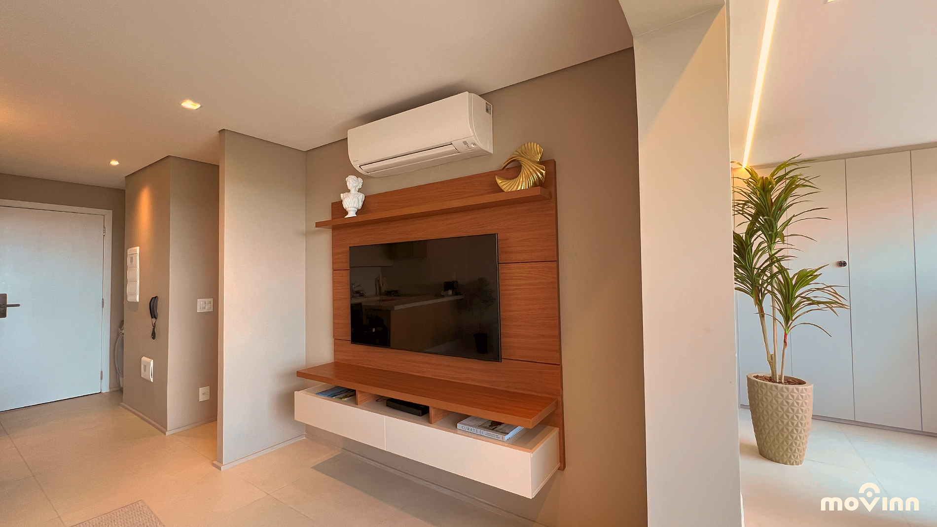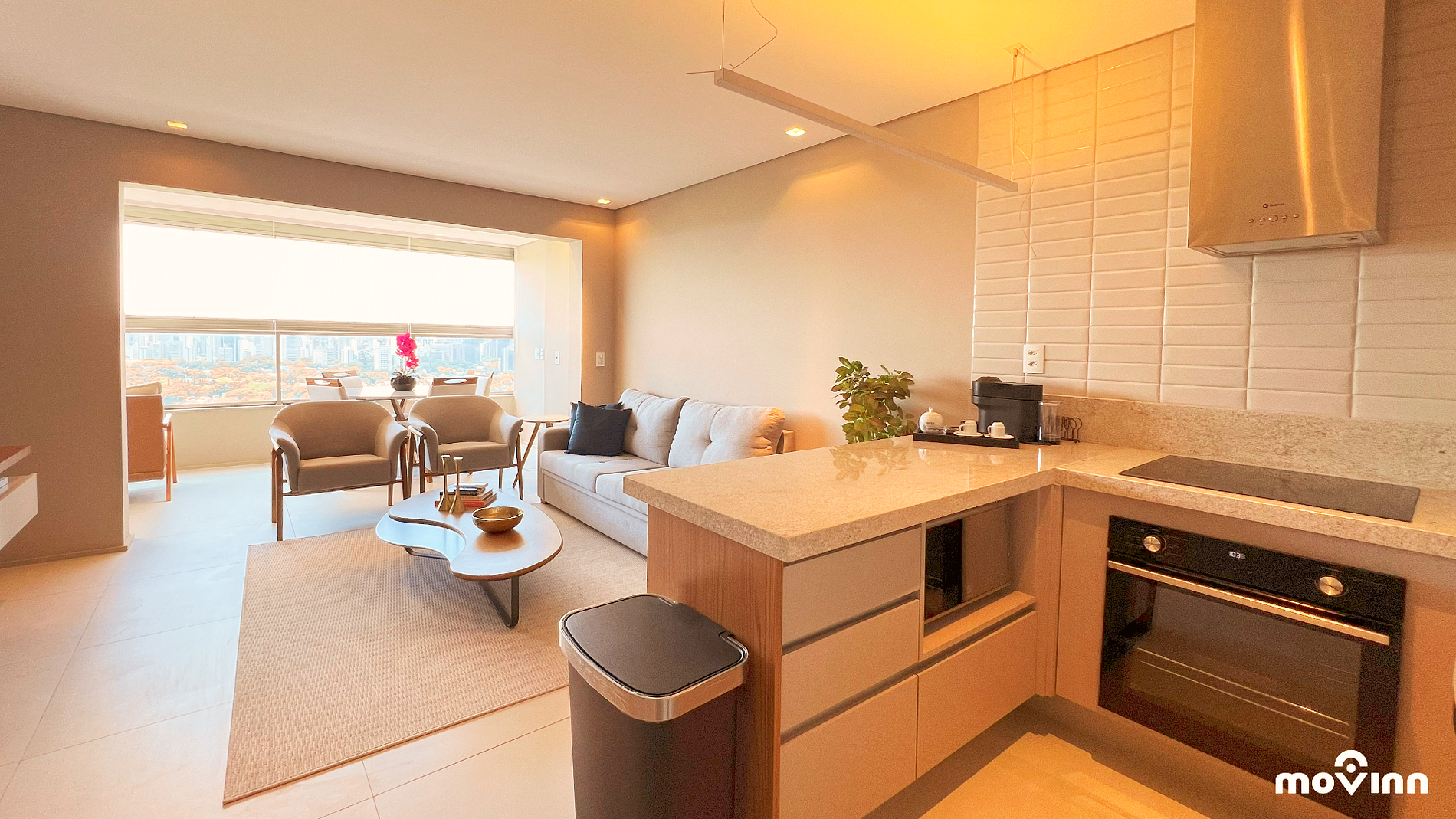 O Apartamento: Com 66 m², o apartamento é completamente equipado para garantir o máximo conforto, conta com cama Queen Size (1,58 m X 1,98 m), sala decorada e equipada, Smart TV, amenities Phytoervas, máquina lava e seca, cozinha com cooktop, exaustor, geladeira, forno elétrico, micro-ondas, cafeteira Nespresso, lava louças e água filtrada diretamente da torneira (Planeta Água PURE 9), com pH entre 6 e 8, prezando pela qualidade e bem-estar. Além disso, oferece uma excelente estação de trabalho